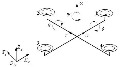四旋翼无人机通过调节四个电机的转速来实现姿态控制。其姿态动力学模型通常由欧拉角(滚转 \(\phi\)、俯仰 \(\theta\)、偏航 \(\psi\))描述。为简化问题,本课题重点研究滚转通道的姿态控制问题,其非线性动力学方程可描述为: