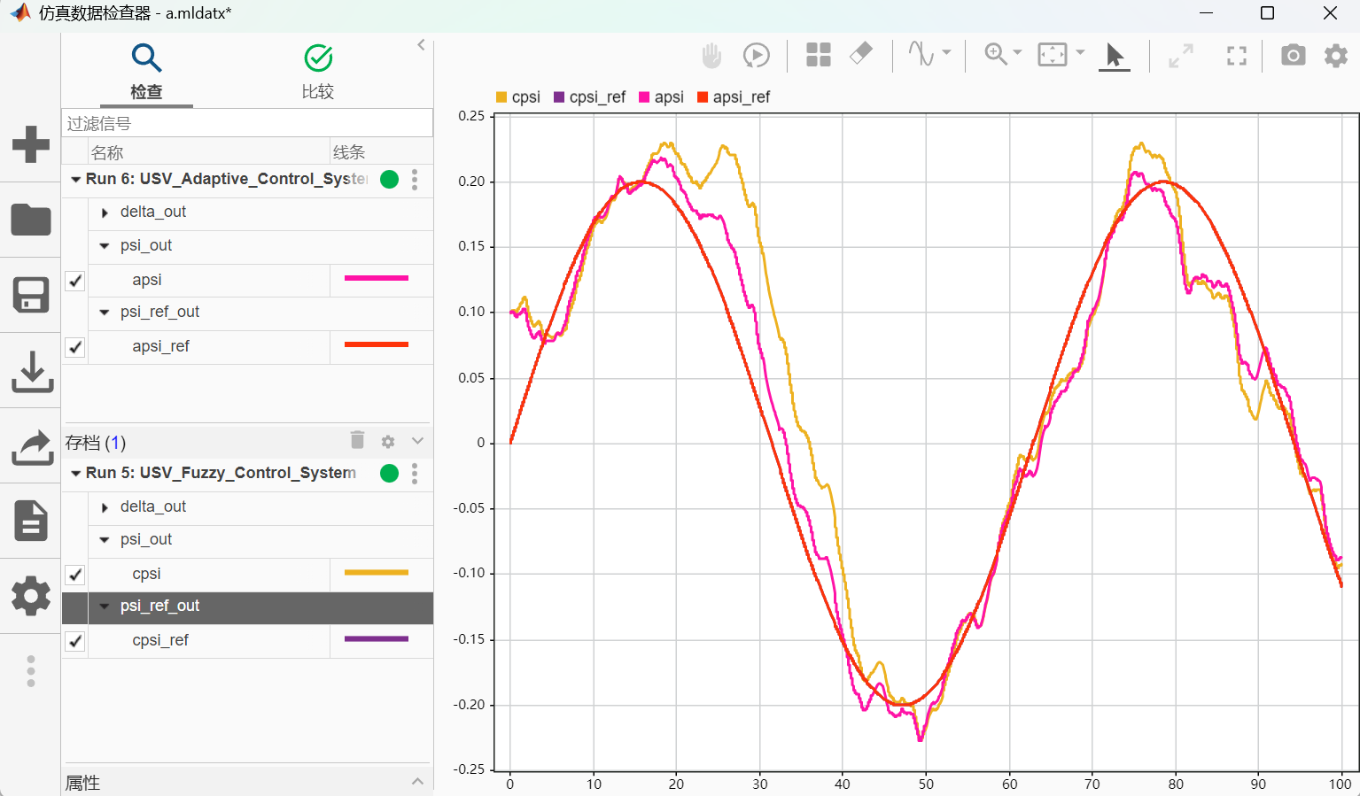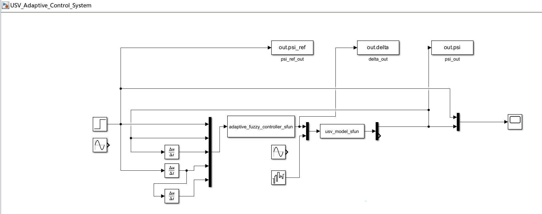 控制目标:设计模糊控制器,使航向 \(\psi\) 跟踪参考信号 \(\psi_{ref}(t)\):