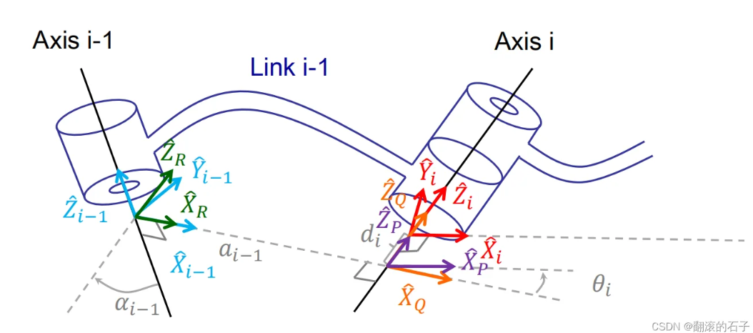 - 沿着 \(X\) 轴平移——坐标系 \(\{R\}\) 沿着 \(X_R\) 轴移动连杆长度 \(a_{i-1}\) 到达坐标系 \(\{Q\}\)